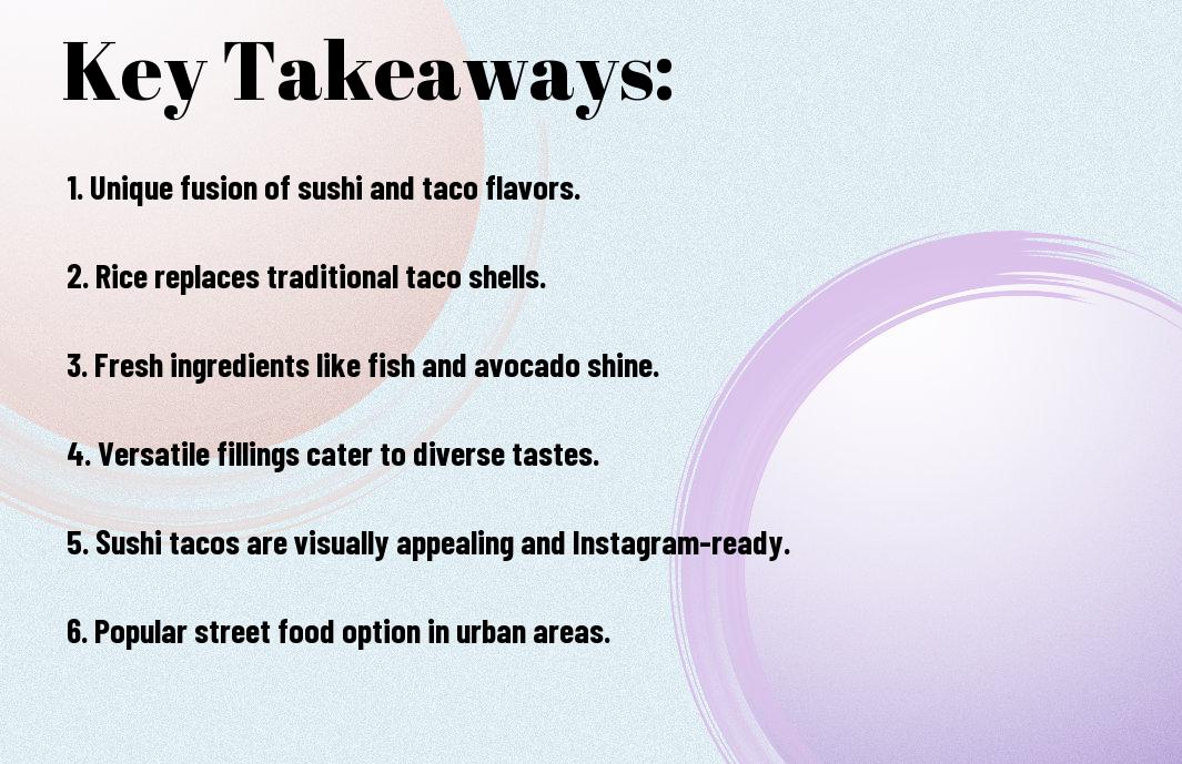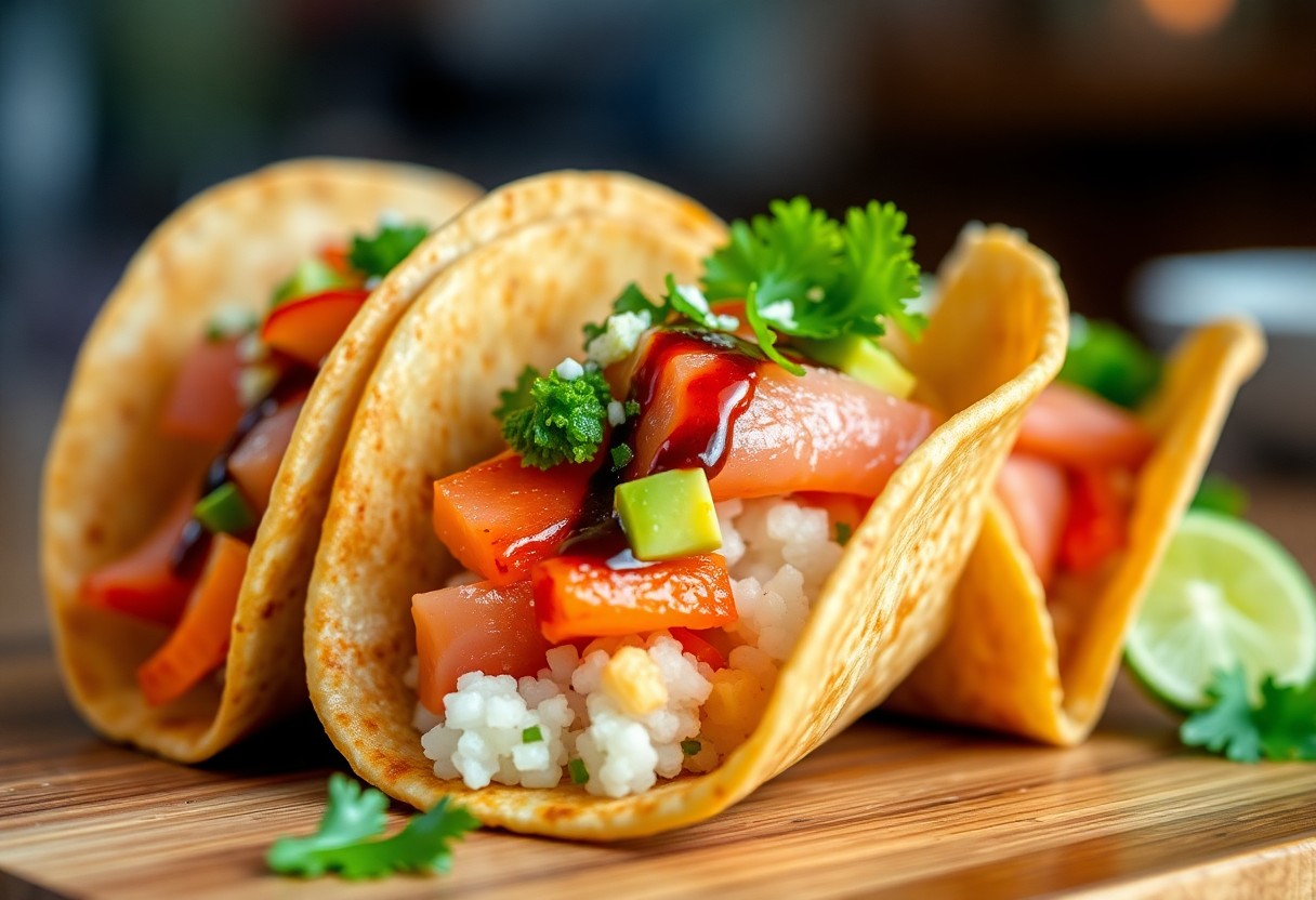 With sushi tacos, you can get creative by mixing and matching fillings based on what you have on hand. Combine chunks of leftover fish with spicy mayo and your favorite veggies for a dynamic flavor experience. These handheld delights not only satisfy your cravings but also allow you to showcase your creativity with various sauces and toppings, making each taco an exploration of flavors!