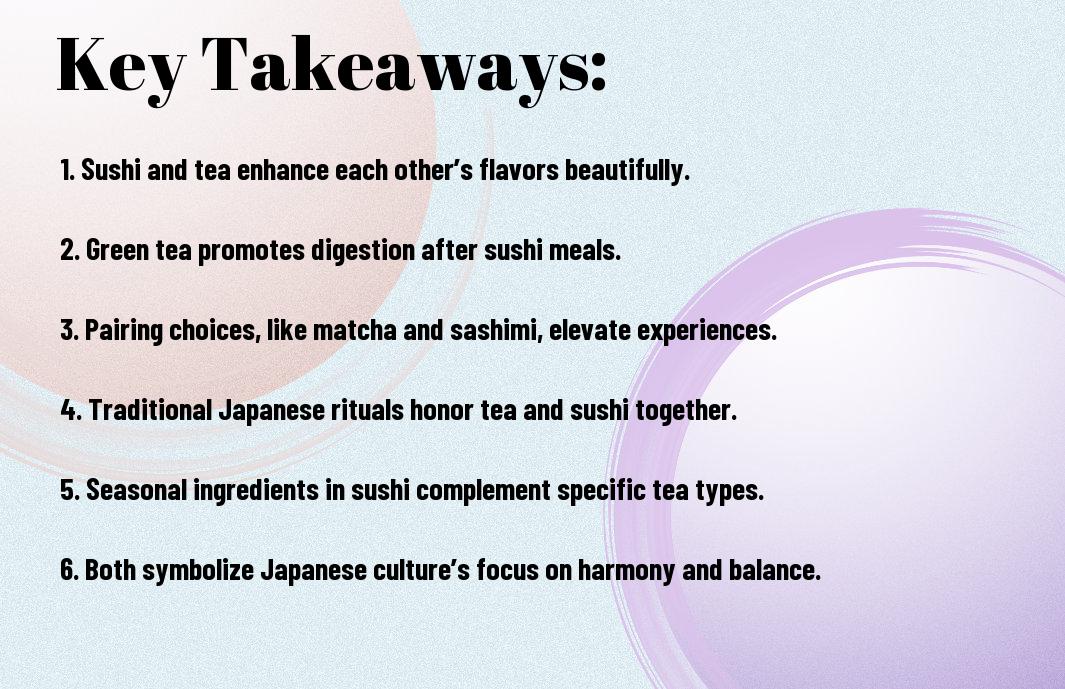 Your exploration of sushi and tea would not be complete without understanding their historical connection. Originating from distinct cultural practices, the pairing has evolved over centuries to symbolize harmony and balance in Japanese cuisine. This relationship has not only influenced culinary customs but has also shaped social gatherings, where sushi and tea complement each other perfectly, enhancing the dining experience.