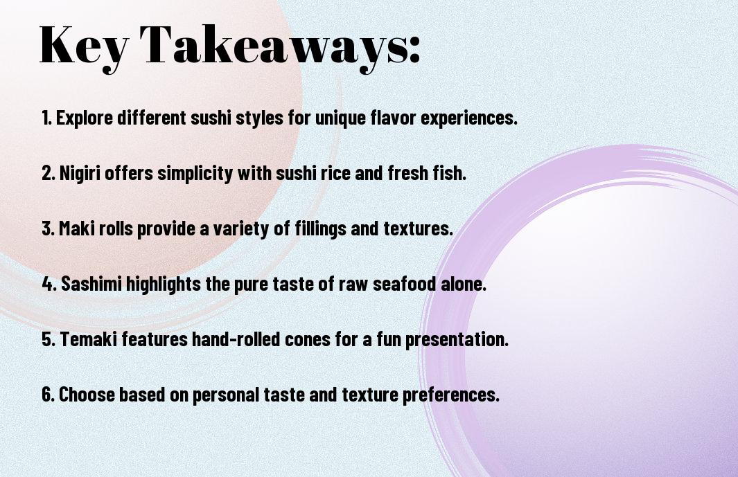 Presently, understanding the various sushi styles allows you to make informed choices that align with your palate and preferences. Whether you lean towards the traditional nigiri or the more creative rolls, each style offers a unique taste experience. As you explore the world of sushi, consider your culinary preferences, and don’t hesitate to try different combinations. Ultimately, the right sushi style for you is the one that delights your senses and enhances your dining experience.