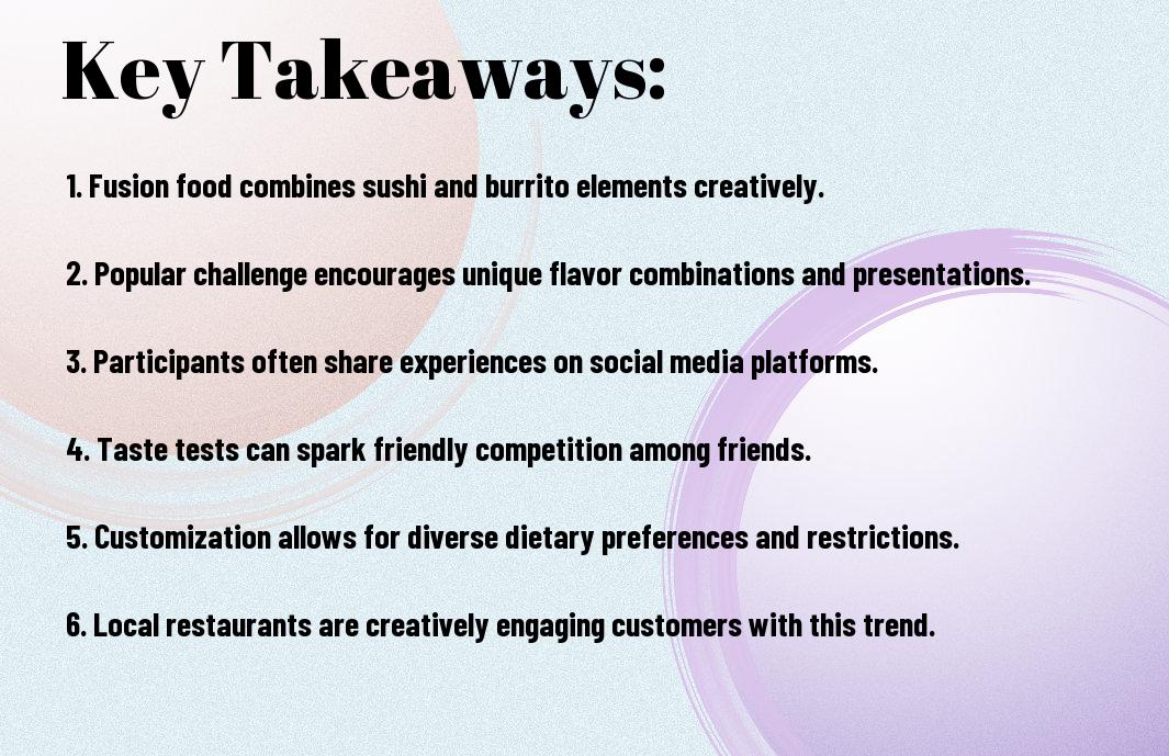Summing up, The Sushi Burrito Challenge offers a unique way to explore the fusion of flavors and textures that make sushi and burritos so popular. By participating, you can not only test your taste buds but also experience the creativity behind this culinary trend. As you investigate into the challenge, you’ll gain a deeper appreciation for the ingredients and craftsmanship that go into each bite. Embrace the fun, share your experience, and perhaps inspire others to take on this delicious mission!