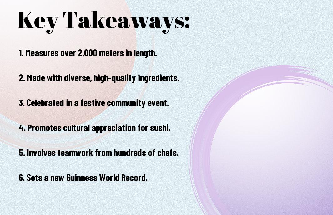 Many culinary achievements capture your imagination, but none quite compare to the grandeur of the world’s largest sushi roll. This extraordinary feat not only showcases the artistry and dedication of sushi chefs but also invites you to explore the cultural significance of sushi around the globe. In this blog post, you’ll discover the details behind this record-breaking creation, including its ingredients, dimensions, and the passionate individuals who brought it to life. Prepare to be amazed by how this colossal sushi roll has redefined what it means to celebrate food.